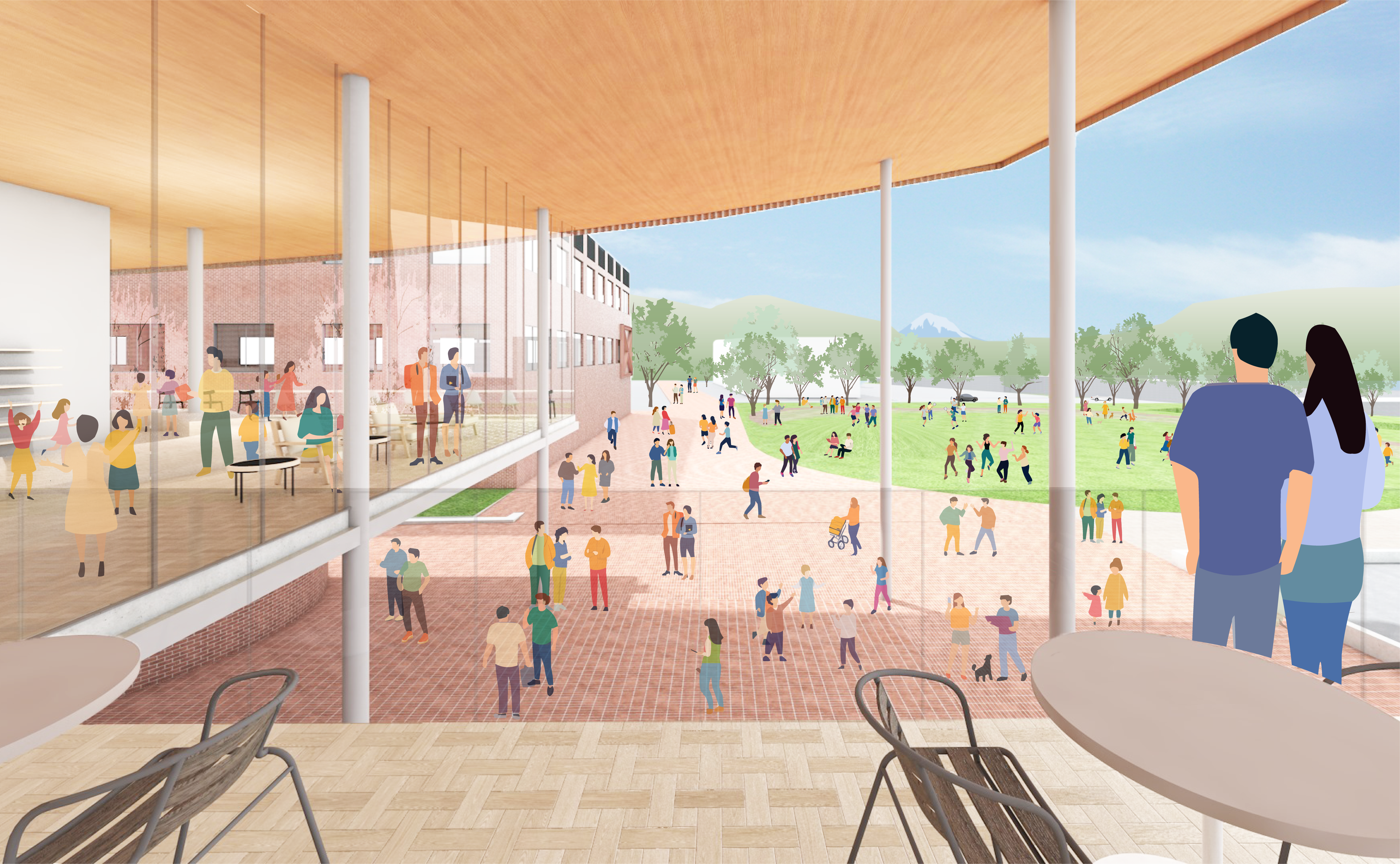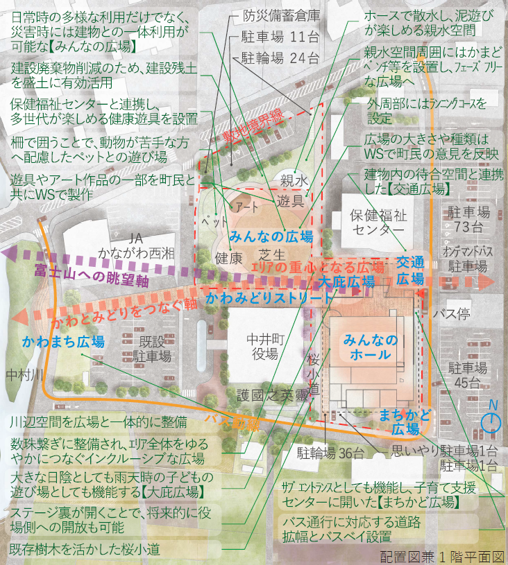 施設整備によって、中井町の“かわ” と“みどり” をつなぐ軸線を中心に、比奈窪56 エリア内外の空間と活動を縫合し、DX と連携させることで、町に点在する既存施設や自然環境での体験と、地域資源や教材などの情報が融合した、「地域に根差した学びと生活」のプラットフォームをつくる。これによって、町に点在する既存施設と豊かな自然をつなぐ回遊と活動を創出することを目指している。