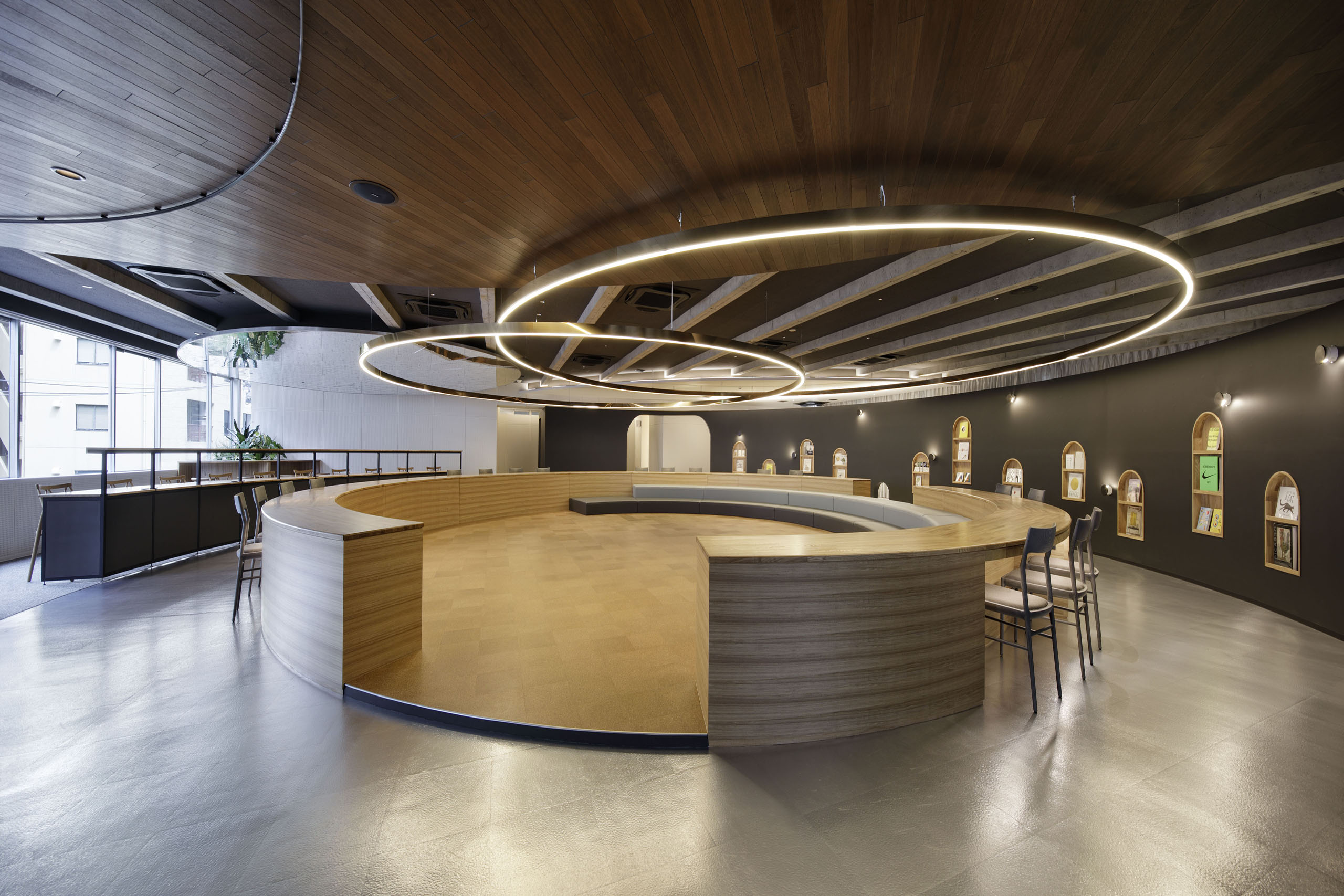 また、社会教育関係団体の本部や大規模なイベント会場に近く、子育て世代から年配者までの幅広い年齢層の会友が利用しやすい立地の良さと、特殊構造による無柱の大空間を活かし、社会教育関係団体が定期で行っている催事に加え、仕事から勉強、交流会や講演会まで、平時とイベント時共に様々な用途に利用できる「多様な居場所群の創造」を目指した。