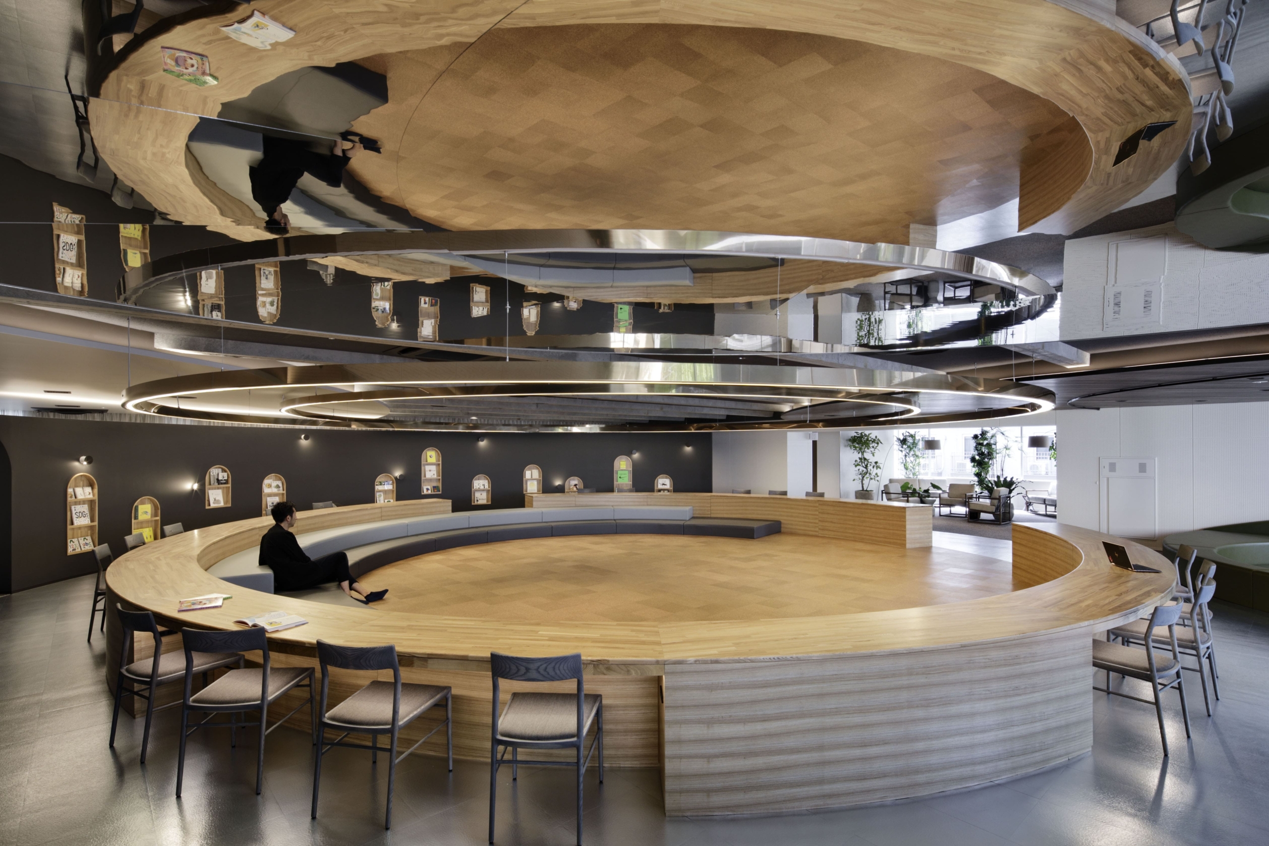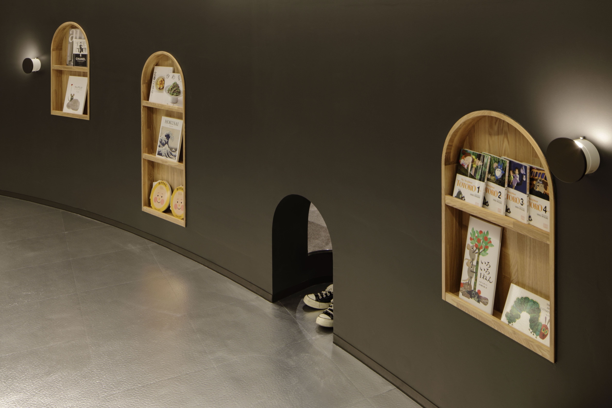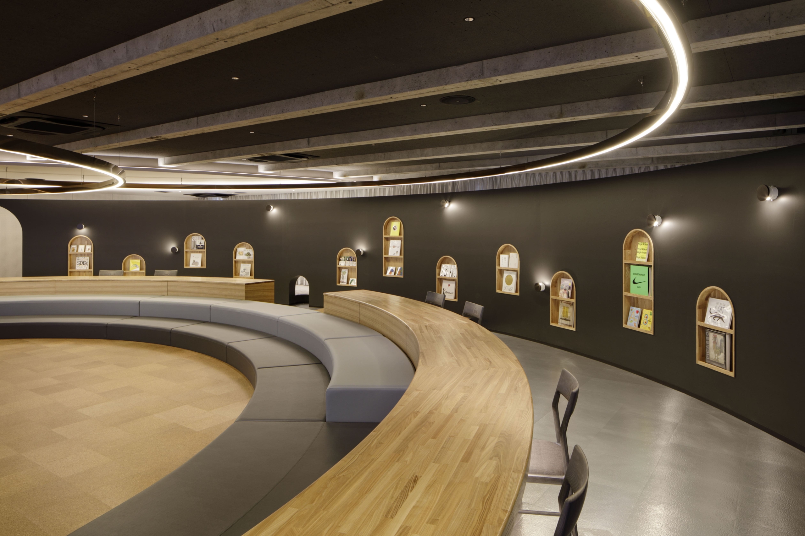 円弧状の黒い間仕切壁は、子供がお絵描きできる黒板と本棚でできており、子供の興味関心を引く仕掛けになっている。背面には、本部会合への準備室となるパウダールームや更衣室を設置している。