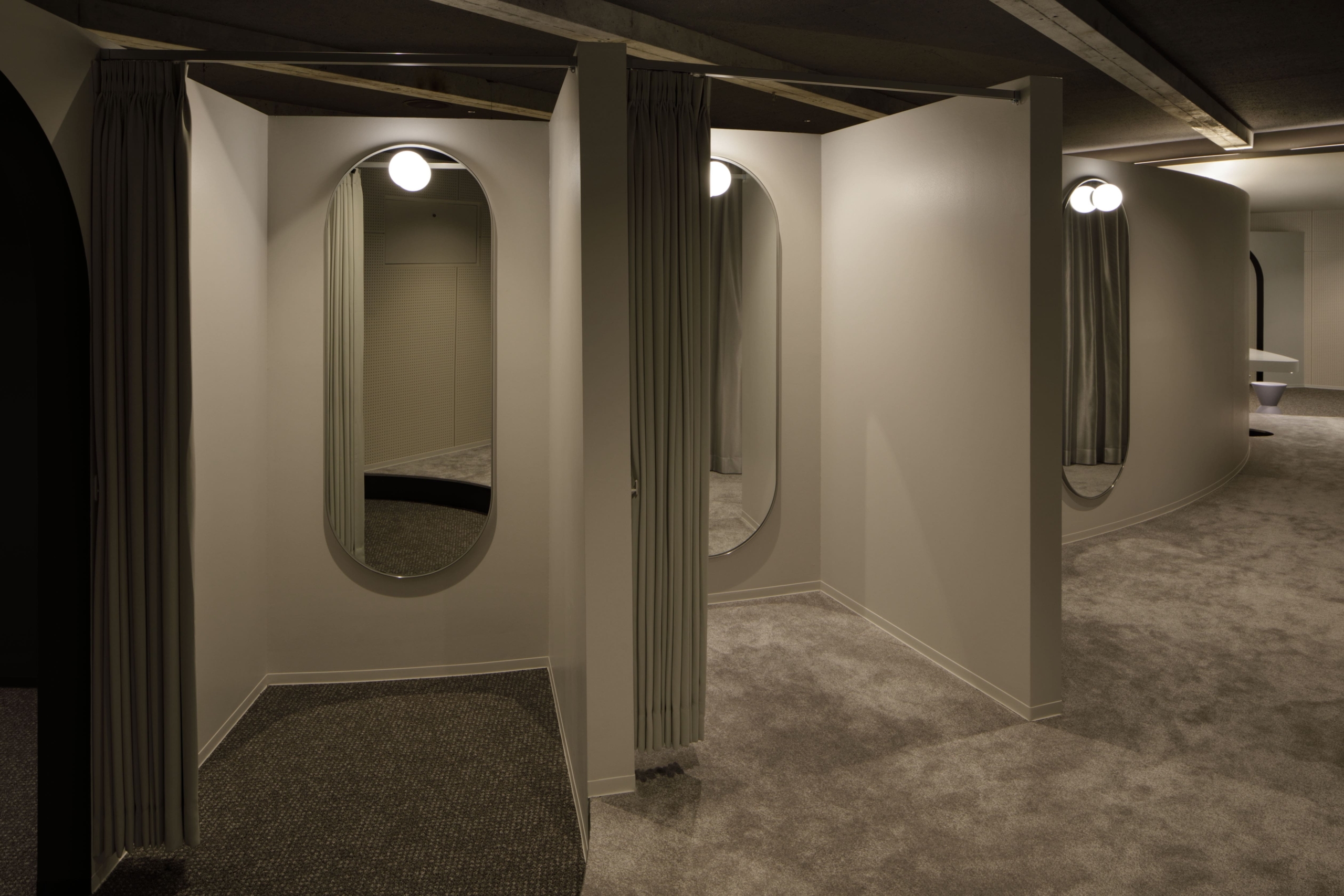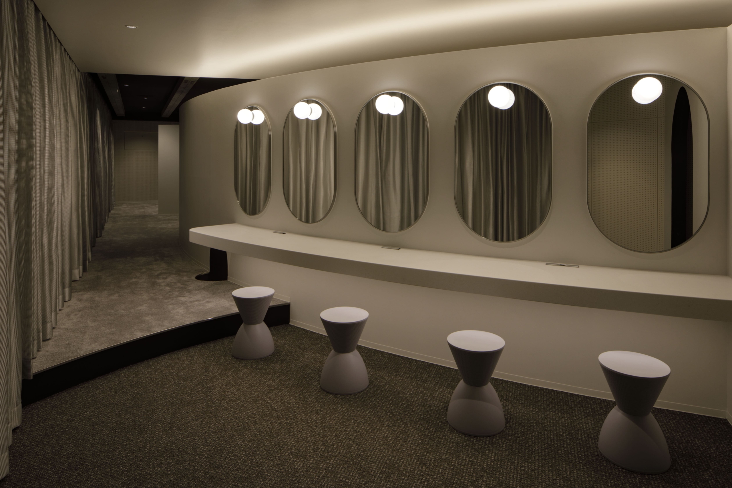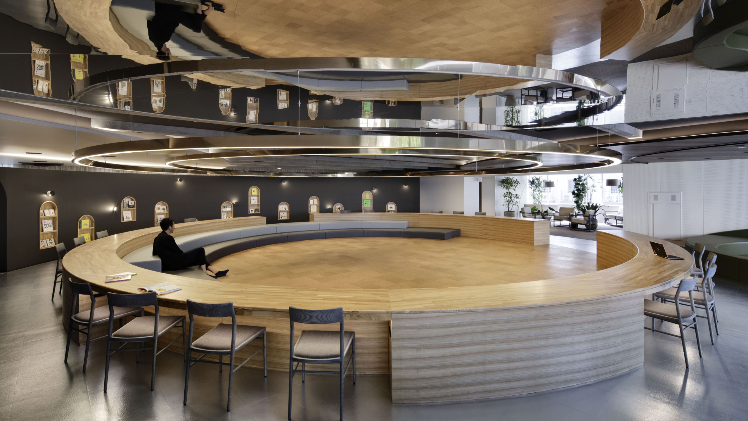 円弧状の黒い間仕切壁は、子供がお絵描きできる黒板と本棚でできており、子供の興味関心を引く仕掛けになっている。背面には、本部会合への準備室となるパウダールームや更衣室を設置している。