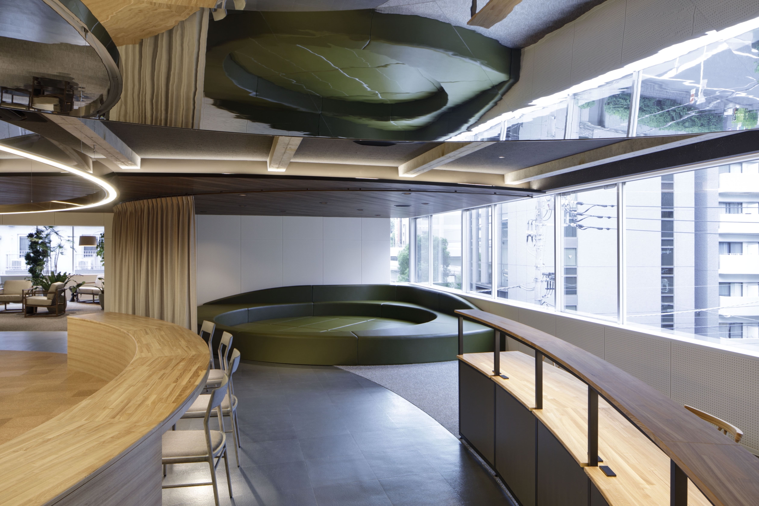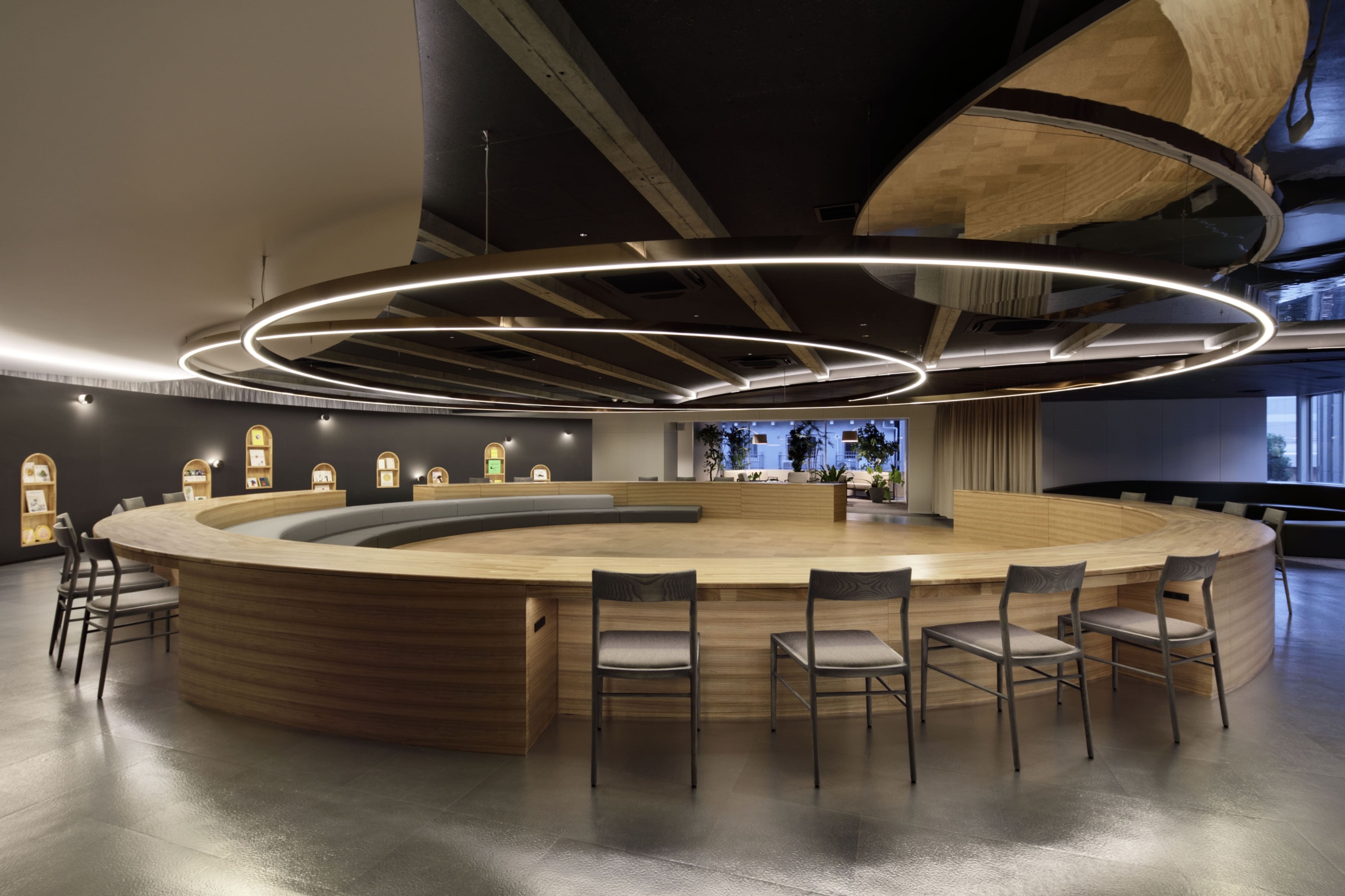 これらのスペースは、カーテンや段差などを適宜利用することで、平時/イベント時のワークスペースや講演会場としてフレキシブルに利用すること可能にしている。
