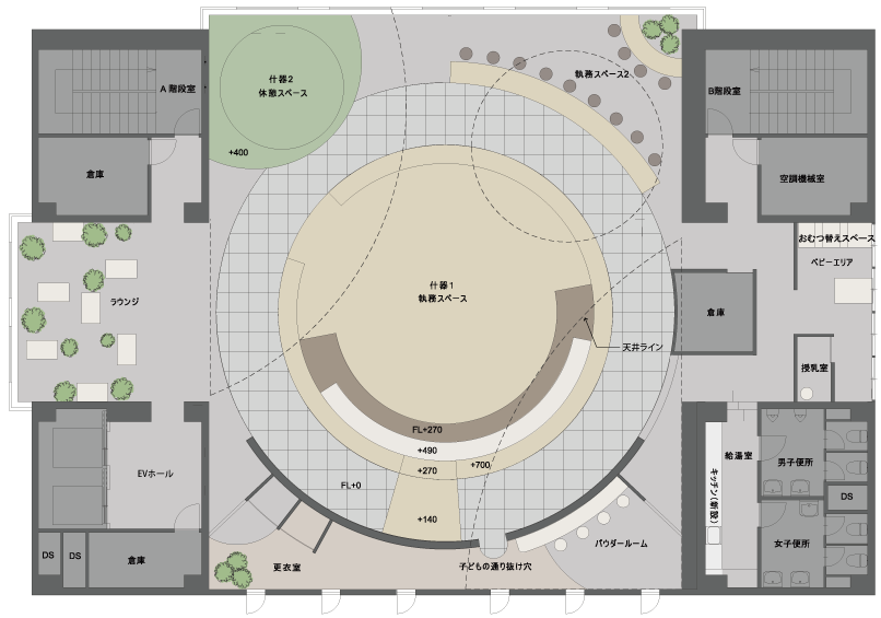 使い手と利用シーンによって、大きく変化するプログラムを、円形の重なりによってできた多様なスペースが可変性をもって許容し、子供の活動に配慮したおおらかな居場所を作り出している。