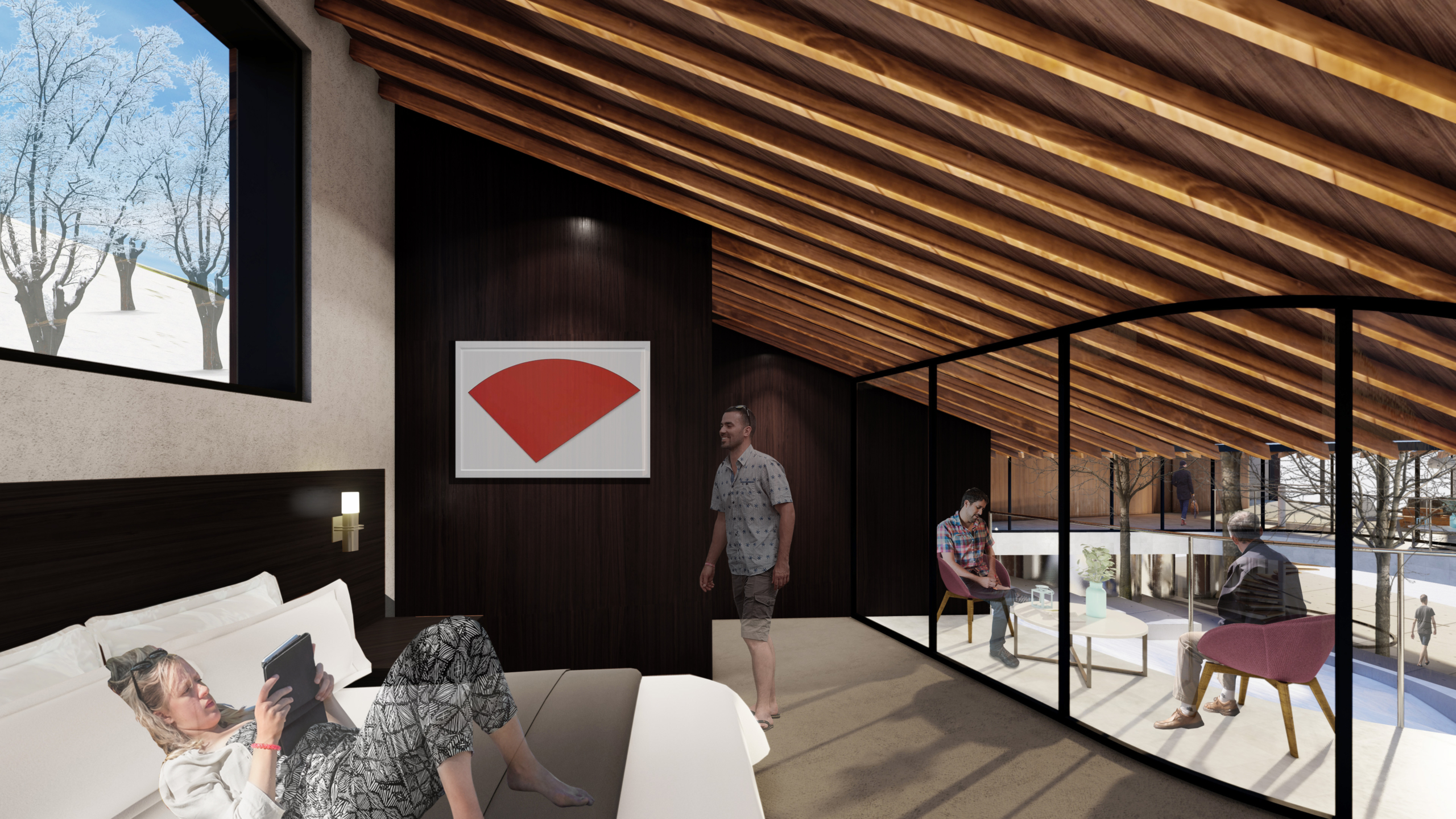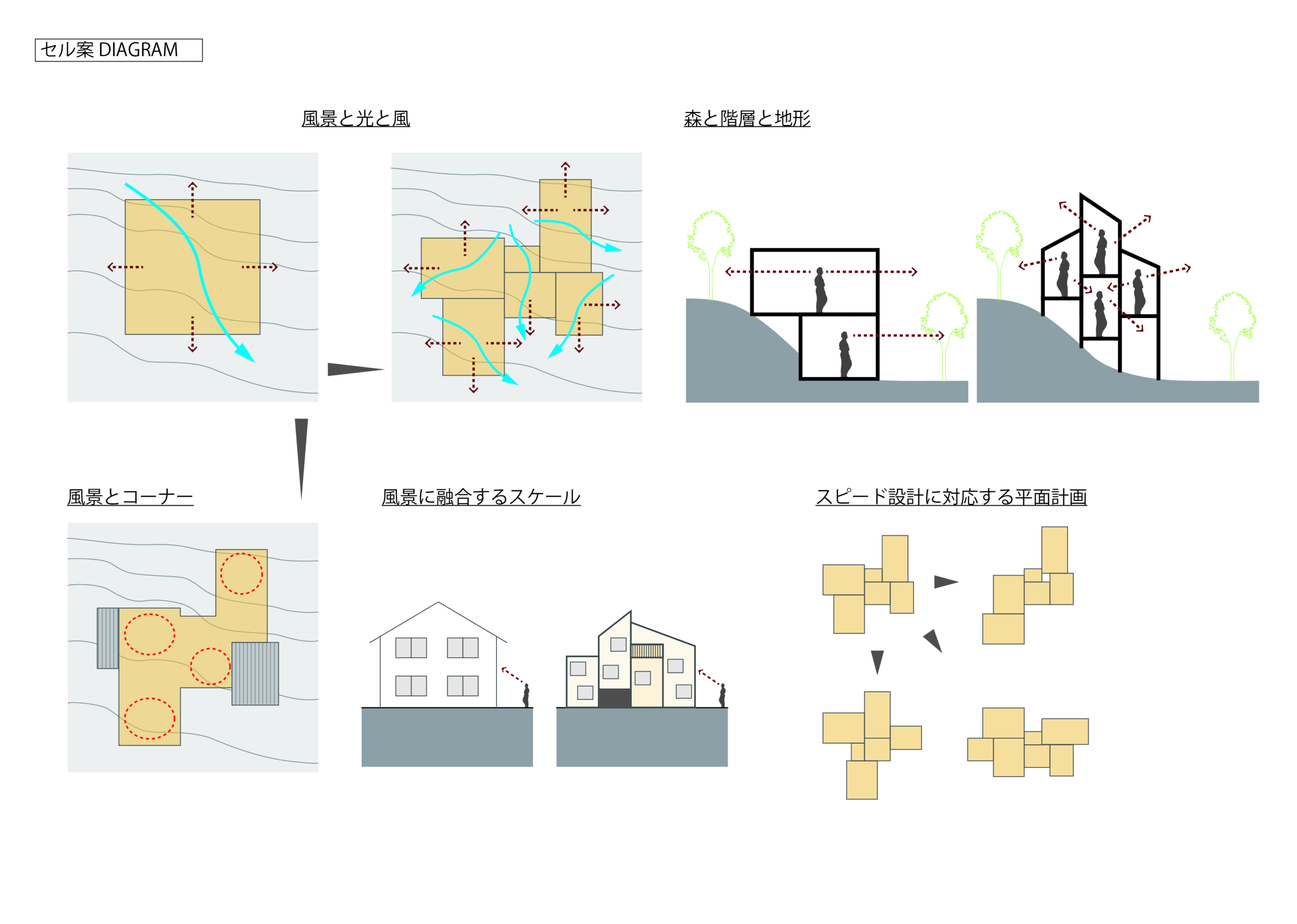 広さや高さ、材質の異なる木箱が集合することで、森の木々 に溶け込むような外観を形成しています。 また、各木箱の内部空間も、景色のフレーミングや仕上げ、開放感や天井高さの違いによって、ゆたかな森との関係をつくり上げています。生活者は、この多様な居場所群を野鳥のように飛び回り、季節や生活に合わせた最適な場所に佇みます。