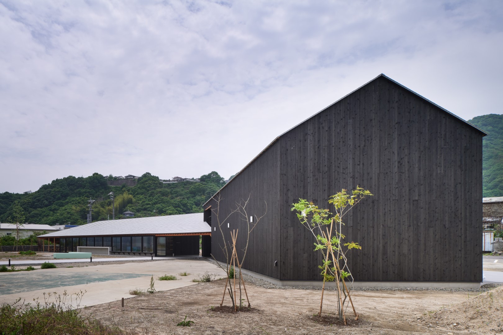 2棟の建築ボリューム、植栽と造船所の廃材で構成した蛇篭壁や盛り土によって、海と一体化したまとまりのある広場をつくった。前面道路から海岸線まで真っ直ぐ延びる軸線は、この広場を貫通して、海と山の風景を対比的に接続すると共に、大屋根ゲートによる空と島並のフレーミングで、アプローチの高揚感をつくっている。また、35mの傾斜した大屋根は、瀬戸内の水平線を強調し、山並みへ視線を誘導する。建築屋内外で起伏する地面や床面、小上りや段々デッキ、カウンターといった居場所と共に、周辺環境の特徴的な風景への視線の誘導、開閉する空間密度や屋内外が一体化した広がりを生成している。醸造棟のデッキ材による緩やかなや階段は海を眺めるベンチとなり、2階バルコニーは新設された醸造所と元造船所の遺構、遠くの島並みを一体的に見下ろす視点場となる。全艶塗装の厨房ボリュームとシルバーの鋼製屋根は、海と空の移ろいを強調し、塩害対策の焼杉外装は、瀬戸内の記憶を想起させる。また、広場から山並みを望むと、建築によって前景の街並みは省略され、背景の空と山の稜線だけが現れる。象徴的な大屋根は、様々な目的や居心地を提供する空間と風景を重層させ、一つの連続した大らかなブランド体験をつくっている。